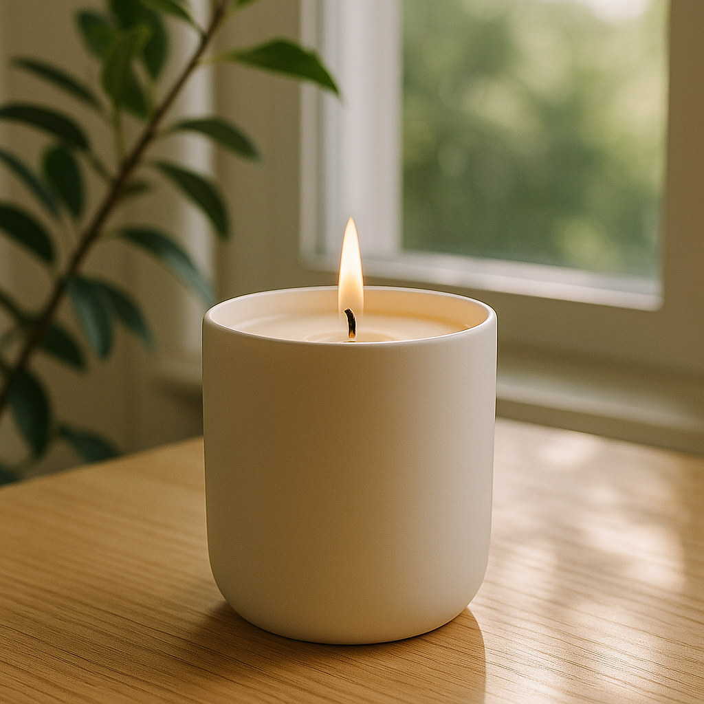 Our minimalist, label-free candles are crafted to blend effortlessly into any home, office, or studio. The design is intentional: a clean ceramic vessel, soft white wax, a single centered wick — no distractions.